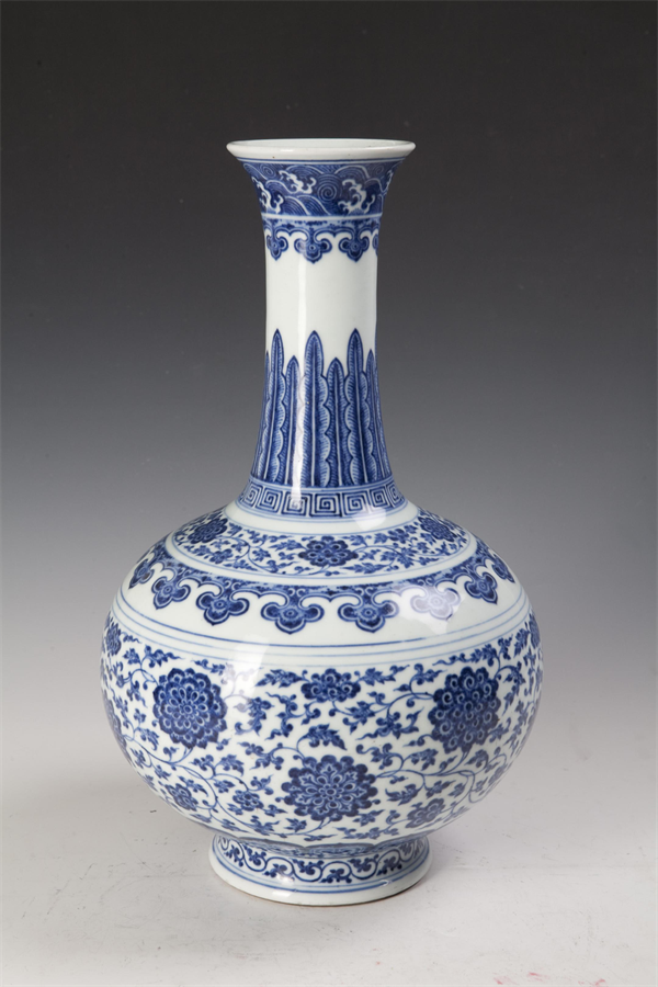 撇口,长颈,球形腹,圈足,颈部轮廓秀美,腹部浑圆,圈足外撇。器形规矩,胎体匀润。通体自上而下以青花绘饰九层纹样,自口沿及肩部分绘江崖海水、如意云头、变形蕉叶纹,自腹部起绘饰回纹一周,其下为缠枝花卉纹及如意云头纹;腹部主体纹饰为双缠枝莲纹,近足处饰变体莲纹及卷草纹。底青花书“大清乾隆年制”六字三行篆书款。