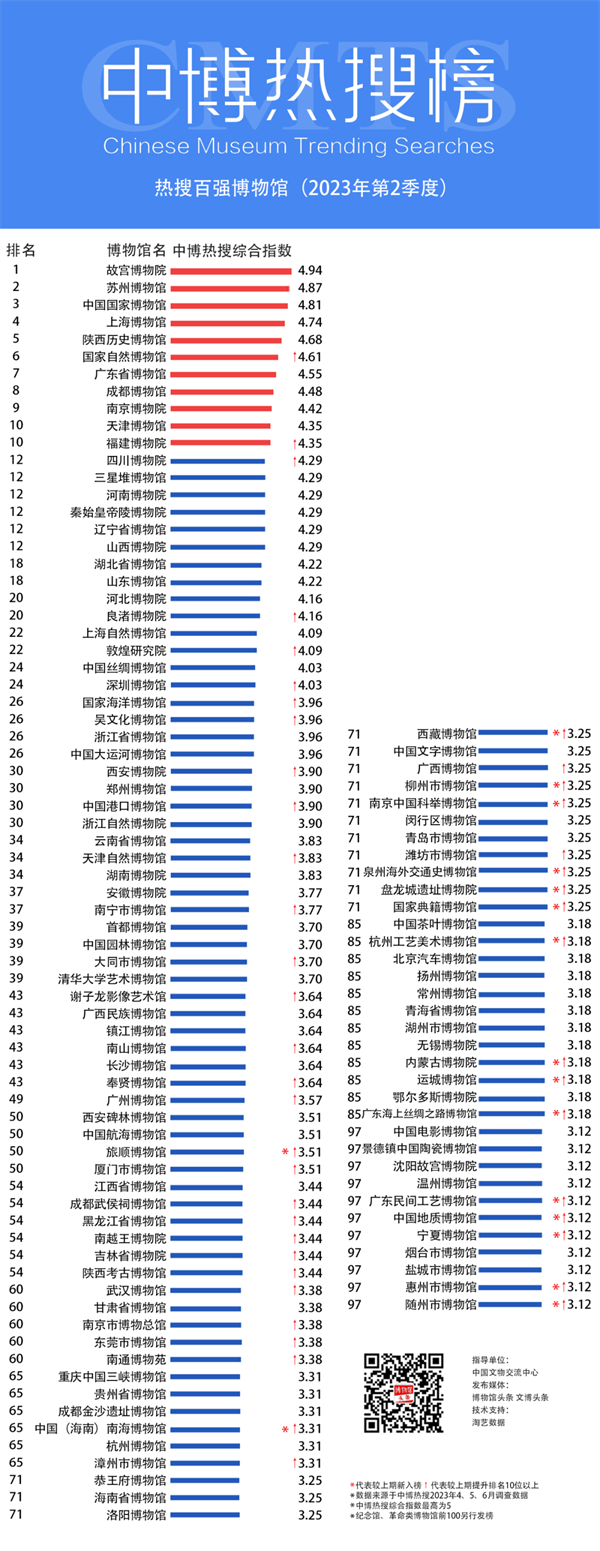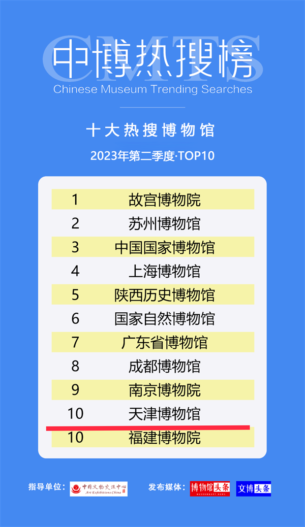 由中国文物交流中心指导,博物馆头条和文博头条统计发布的「中博热搜榜」今日发布2023年第二季度最受网友关注的百强博物馆榜单,百余家受到网友高频搜索的博物馆上榜,天津博物馆荣登百强榜单第十名。同时,在刚刚发布的2023年第二季度“十大热搜博物馆”中位列第十名。