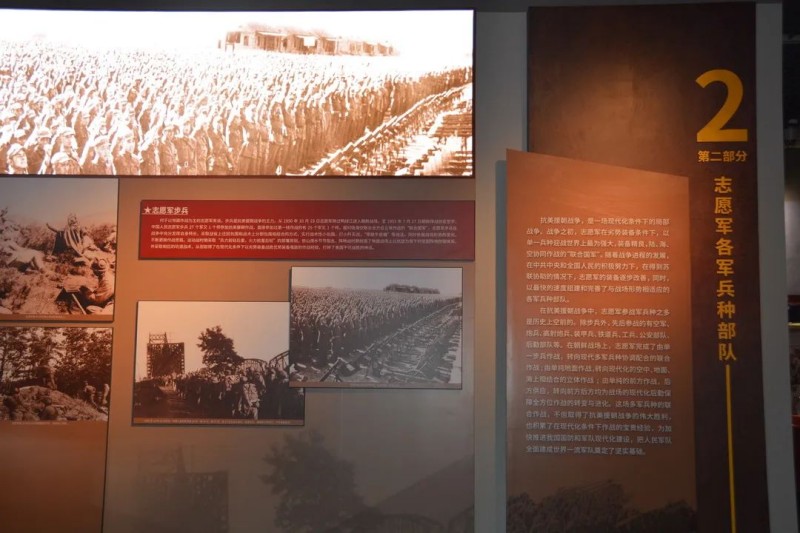 第二部分主要介绍志愿军参战的各军兵种。集中展现了志愿军步兵、志愿军空军、志愿军炮兵、志愿军防空部队、志愿军铁道兵、志愿军工兵、志愿军装甲兵、志愿军公安部队、志愿军后勤部队共九大军队和兵种的情况。