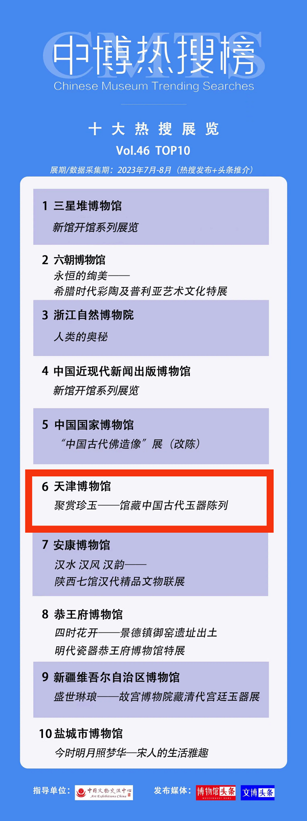 中博热搜榜今日发布最新一期(第46期)“博物馆十大热搜展览推介”,本期推介展览为2023年7—8月以来受到全国网友高频搜索和较高关注的全国博物馆十大文博展览。天津博物馆“聚赏珍玉——馆藏中国古代玉器陈列”位列第六。成绩的取得,离不开广大观众的厚爱,很多外地游客为了一幅画、一件文物而奔赴一座城,掀起了暑期观展热潮。我们也将继续努力,与观众携手同行,共创美好!