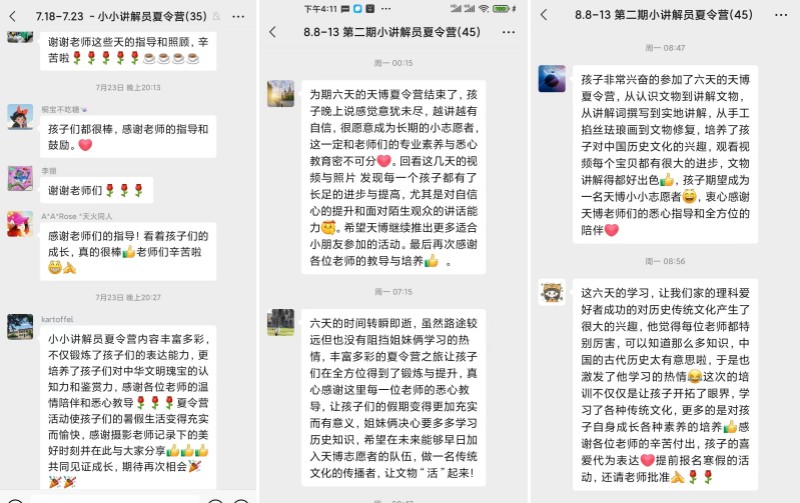 课程中,孩子们的反馈非常积极。他们开始时对口腔体操和发声课程充满好奇,喜欢参与互动环节,积极回答问题,也会在课后跟着练习,提出问题,解决问题。通过这次课程,孩子们逐渐掌握了讲解的正确呼吸方法,提高了口腔肌肉的灵活性,发音的准确性,同时也增强了自信心。他们的家长也反映孩子在课程后他们的讲解更加连贯,表现更加自信。这些积极的反馈让我感到非常满足和有成就感。
