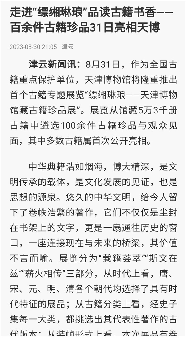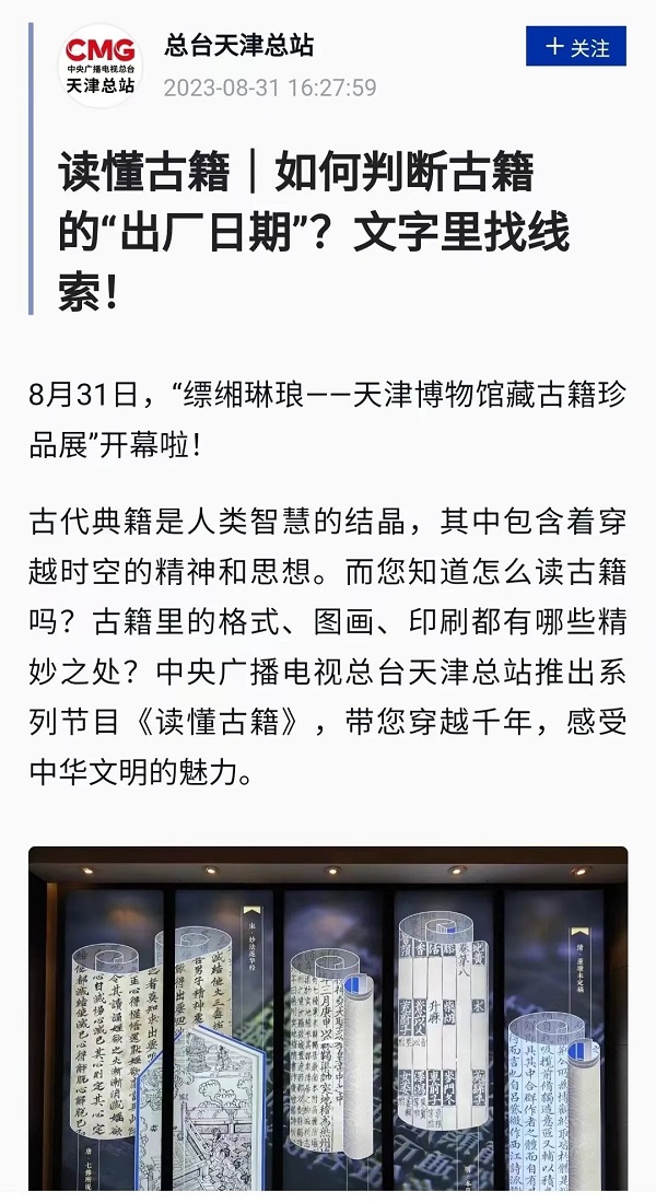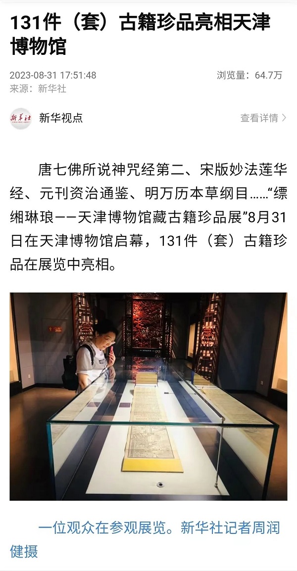8月31日,作为全国古籍重点保护单位,天津博物馆隆重推出首个古籍专题展览“缥缃琳琅——天津博物馆藏古籍珍品展”。展览从馆藏5万3千册古籍中遴选100余件古籍珍品与观众见面,其中多数古籍属首次公开亮相。近日,新华社、央视新闻、津云、天津日报、天津电视台、今晚报、北方网等多家媒体相继报道展览盛况。邀您走进“缥缃琳琅”,品鉴古籍善本之美。