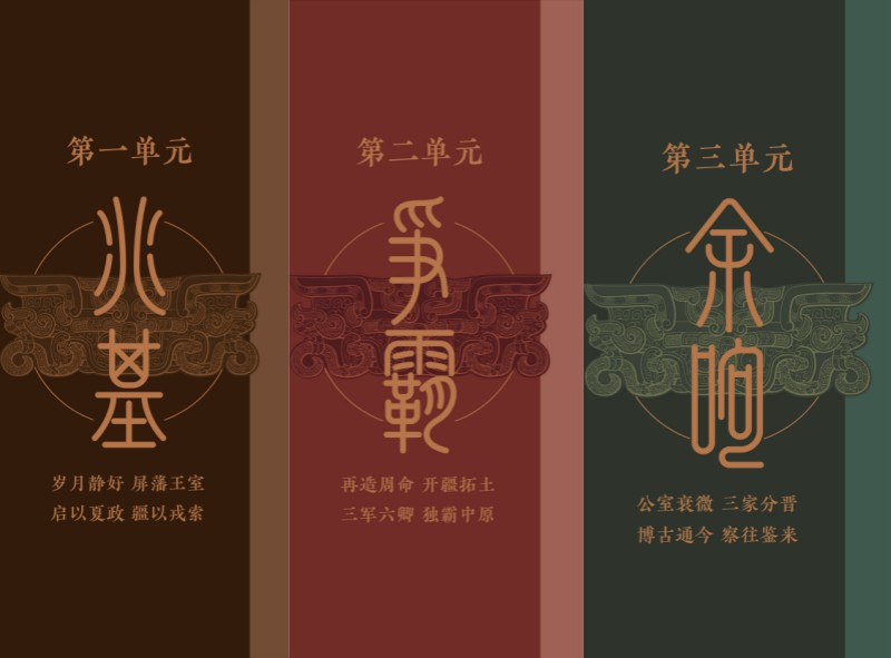 首先确定大纲结构:以时间为序,将展览分为三个单元,根据每个单元具体内容决定是否下设二级标题,后拟定各级标题名称。展览主题是晋国称霸的历史进程,三个单元循序渐进,分别为奠定基础阶段、扩张和称霸阶段、分裂及产生影响阶段,因此单元标题分别拟定为:兆基、争霸、余响,扣合展览主题的同时明确展览线索。同时单元说明不再以大量文字表述,而代之以简洁明确的16个字,精炼概括本单元展示内容,形式较为新颖,可能会给观众留下较深印象。