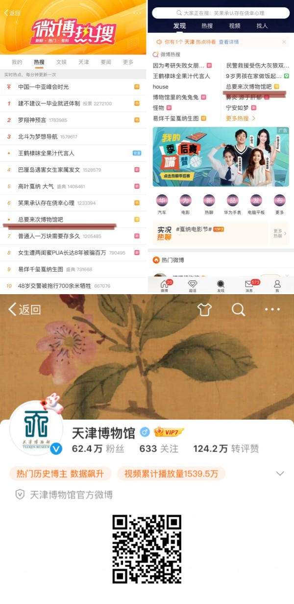 天津博物馆官方微博自开通以来,坚持每日更新,6年来共推送博文2万余篇,阅读量超过7亿,关注人数约62.4万人,连续四年获得“全国十大博物馆”称号,围绕让文物活起来,开设众多观众喜闻乐见的话题,如“天博藏珍”“我在天博看展览”等介绍馆藏文物展览的栏目,讲述精彩的历史故事。2023年推出的#总要来次博物馆吧#话题吸引了百万用户参与讨论,话题词阅读量达到4400万,多次登上微博热搜榜。