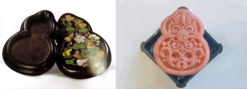 左:清 卢葵生制款葫芦形漆砂砚 | 右:葫芦白桃多多奶黄月饼