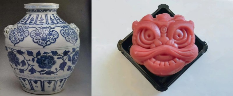 左:元 青花缠枝牡丹纹狮耳罐 | 右:醒狮蔓越莓香芋月饼