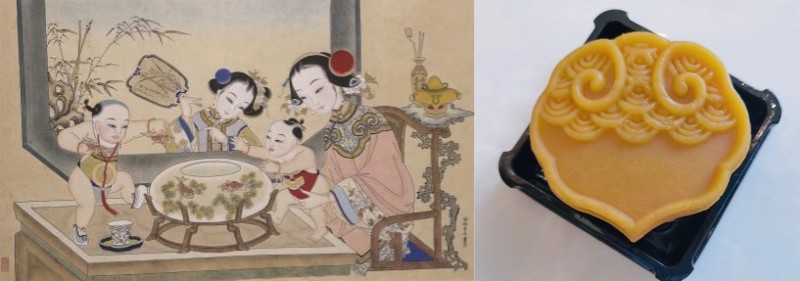 左:清 乾隆版杨柳青年画《金玉满堂》 | 右:祥云奶黄紫薯牛奶月饼