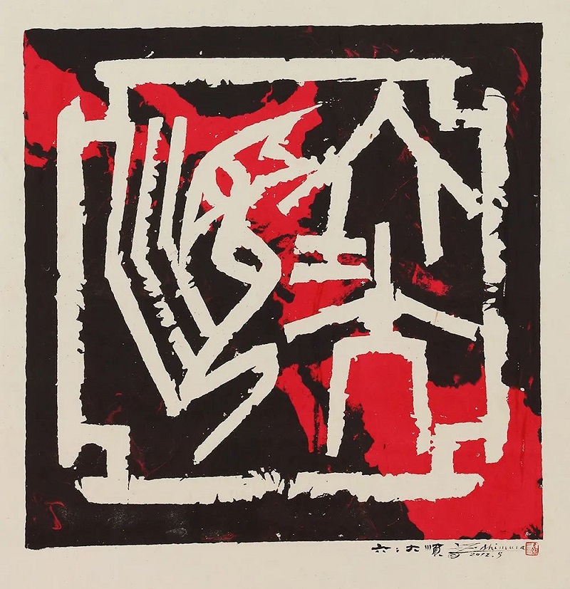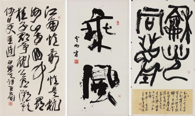 这种情况在“传承·流变——中日韩书法名家作品展”仍然存在,不过,就当下的书法创作来说,对于视觉形式的注重无疑占有更加重要的地位。一方面,当下的书法创作更加注重与空间的适配,作品幅面的增大、笔墨质感的对比、章法关系的加强等无不来源于这种需求。另一方面,借鉴其他艺术形式进而突破书法的形式外延的思路也行之日久,这种外化的拓展实际也在促进对于书法本体的重新认知。