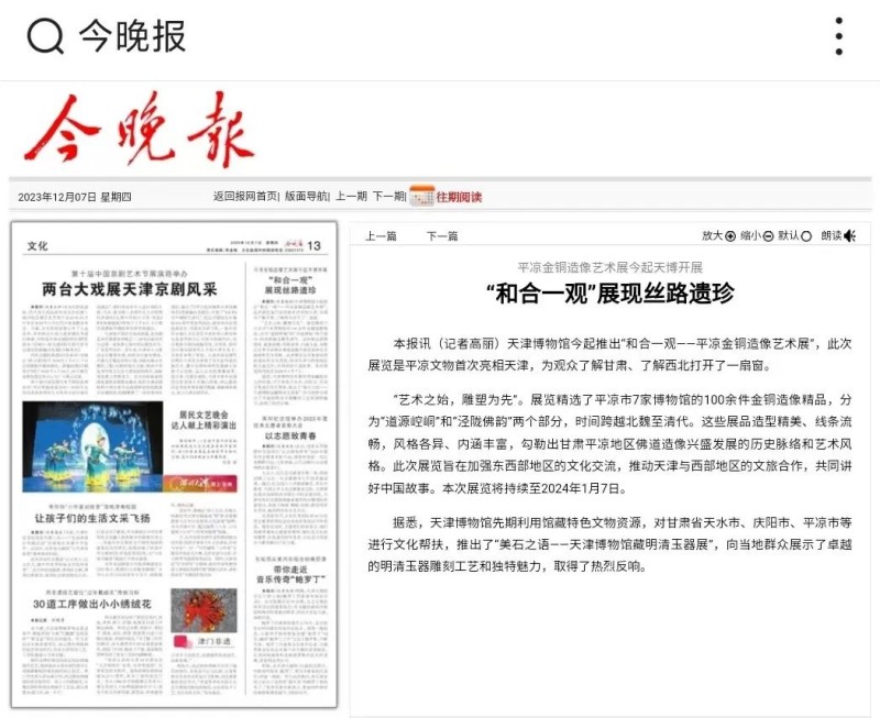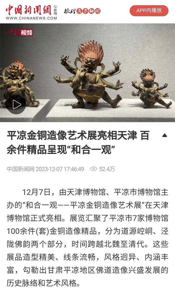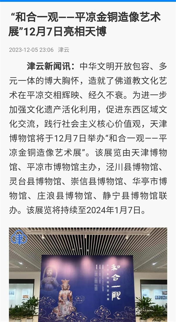 为深入贯彻落实习近平文化思想,更好地促进津甘两地文化协作,加强文化遗产活化利用,12月7日,“和合一观——平凉金铜造像艺术展”在天津博物馆启幕,100余件(套)金铜造像精品在展览中亮相。此次展览是平凉文物首次亮相天津,为我们了解甘肃、了解西北打开了一扇窗。展览一经推出即受到媒体朋友的广泛关注,新华社、中国新闻网、津云、今晚报等媒体纷纷报道。欢迎大家走进展厅,撷取丝路遗珍,开启美的体验。