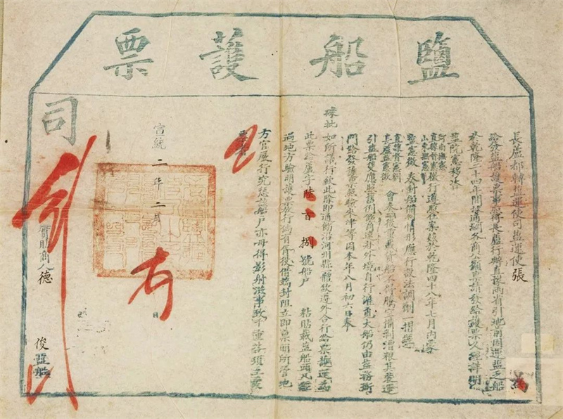 此件为长芦盐运使张镇芳于宣统二年(1910年)二月发给"芦"字陆佰捌号船户的盐船护票,此护票实贴于商人德俊的运盐船上。"凡经过地方验明放行"。