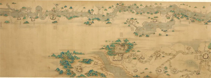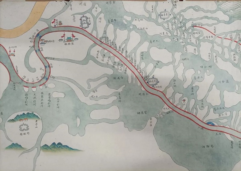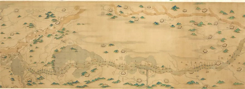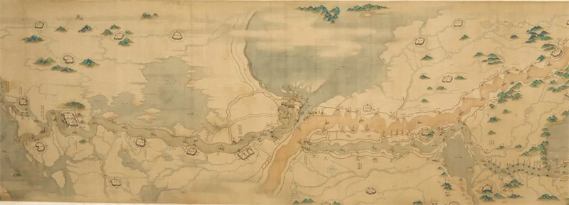 此图无题跋,作者不详,根据图上的地名及河工地段推断,大约 绘制于清乾隆年间。清代京师给养主要靠征自江、浙、赣、皖、湘、鄂、豫、鲁等省的漕粮,由于漕粮运输主要靠贯通南北的大运河,所 以漕运水道便成为国家得以正常运转的经济命脉,因而倍受关注。该图采用平立面结合的鸟瞰式形象画法,描绘了自洞庭湖和岳州府开始, 经长江、运河至北京的水道路线及沿途城市、山脉、河流、湖泊、闸 坝、桥梁、村庄等地理景致。