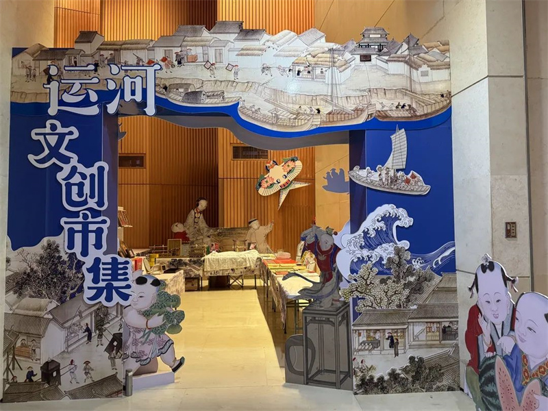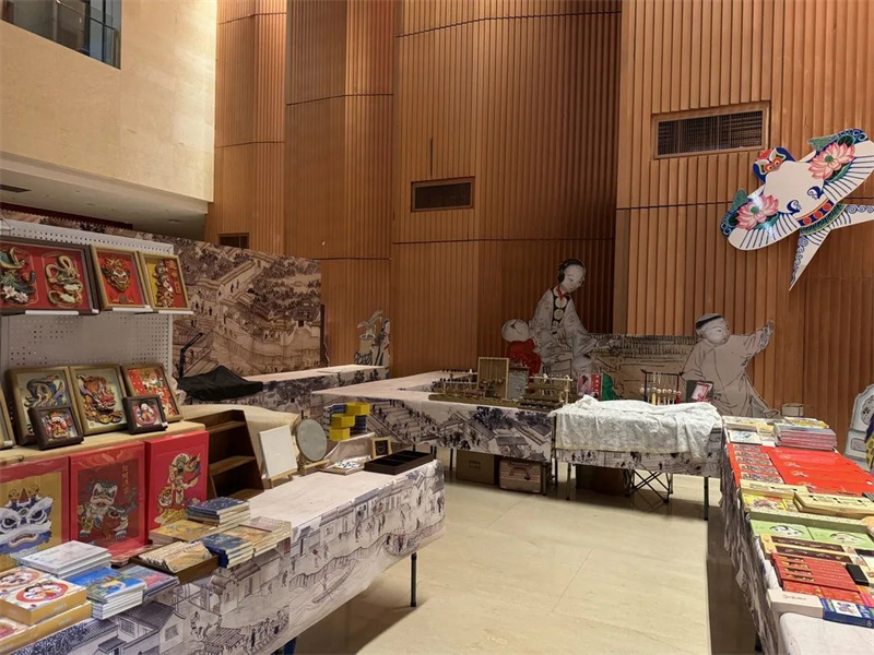 配合展览推出特色“运河文创市集”,来自杨柳青画社、非遗文创、天博原创设计、古风饰品、手工手作等多位摊主带来了各式各样精美的文创产品。市集中穿插着许多杨柳青年画中的人物、景观,所有藏品均选自馆藏文物。整个市集装饰统一,由展厅的主背景“运河”蜿蜒而出,每一个摊位上的桌布都是运河沿岸不同的风景,所有摊位连在一起就组合成一幅“路河督运图”。