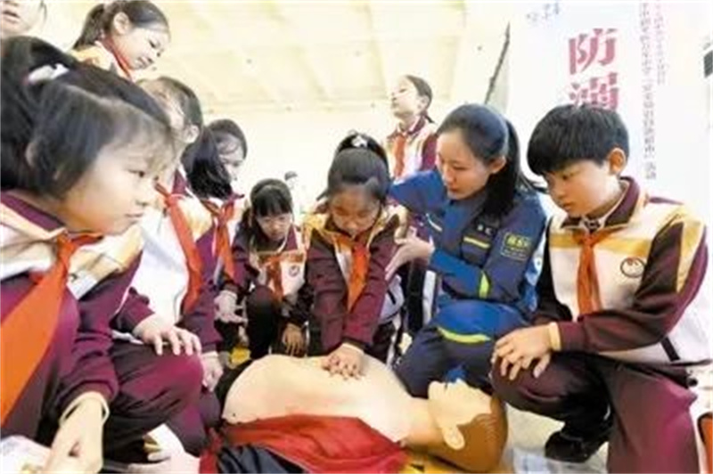 图丨安全教育宣传活动中,和孩子们互动进行心肺复苏模拟演示