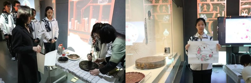 课程分为“讲解观展”、“文化体验”两个部分。由天博社教老师引领同学们进入展厅,介绍藏品及背后的故事,唤起同学们对传统文化的热爱,对话历史,对话文化。之后在展厅组织学生参与杨柳青木板年画的拓印与绘制过程。学生在创作中将理论知识与动手实践相结合,获得了不一样的博物馆学习体验。