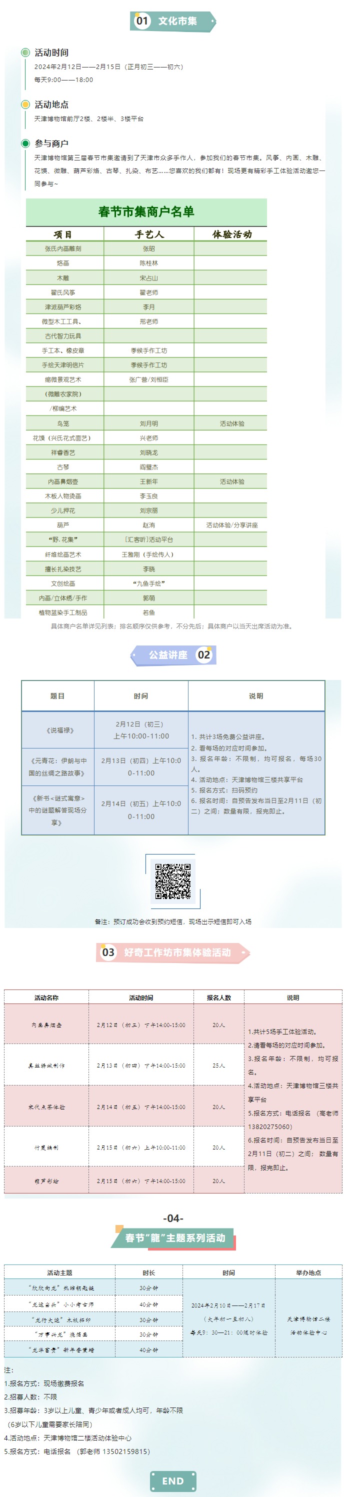年年景不改,岁岁人常在。年年岁岁花相似,岁岁年年人不同。新春佳节将至,天津博物馆将于2024年2月12日——2月15日(正月初三——初六)推出“齊楽龍龍——天津博物馆甲辰春节文化市集”活动,本市集为了更好地满足市民日益增长的精神文化需求,实现以文塑旅,以旅彰文的目标,支持传播中华优秀的传统文化与民间手工艺,让更多市民、爱好者参与进来,近距离感受传统文化、非遗传承历史。