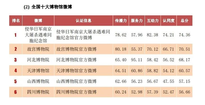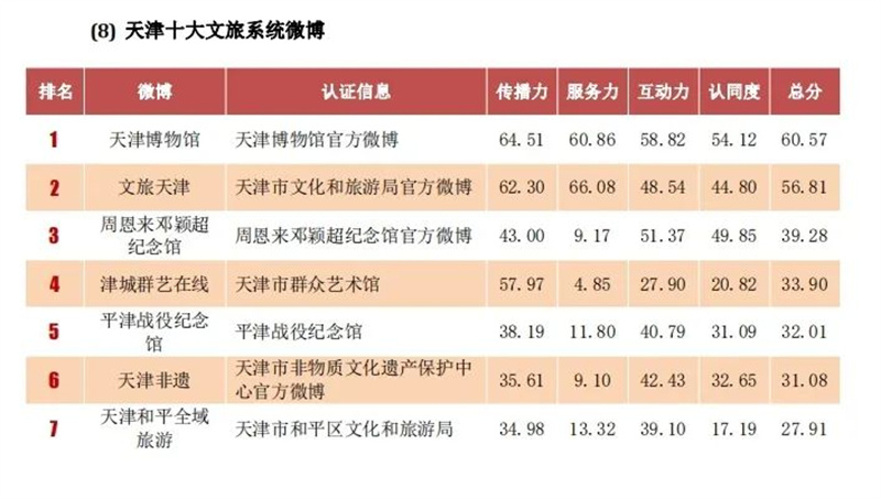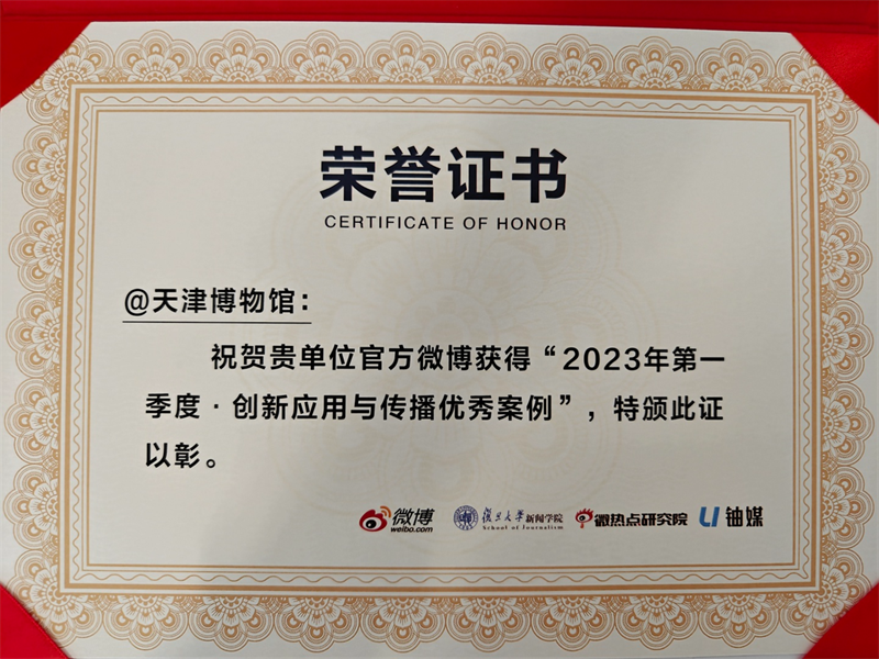 日前,人民网舆情数据中心联合新浪微博政务风云榜正式发布《2023年政务微博影响力报告》,天津博物馆上榜全国十大博物馆微博第四位,并连续五年蝉联“天津十大文旅系统微博”第一位。