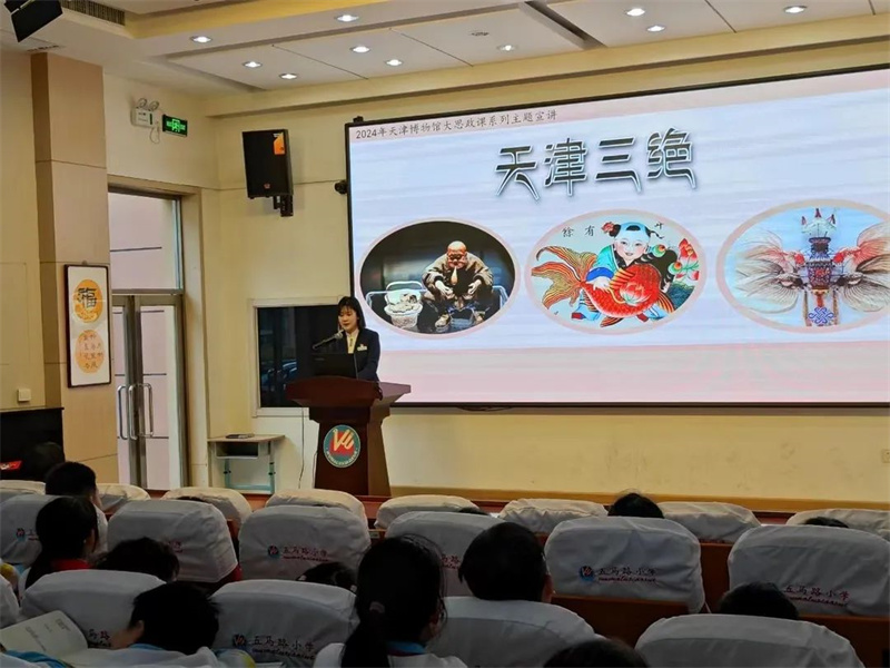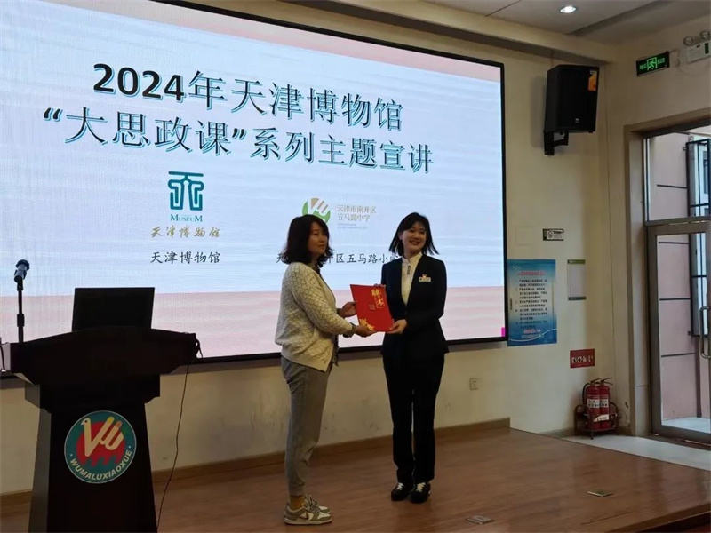 3月5日,天津博物馆第一堂“大思政课”在南开区五马路小学启动,五马路小学为优秀讲解员张凌菲老师颁发“大思政课”教师聘书。