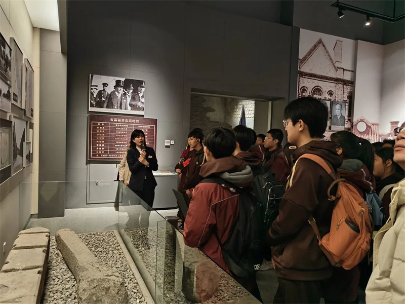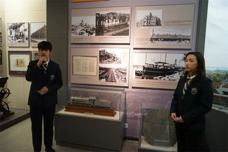 授牌仪式结束后,百余名学生们走进“中华百年看天津”展厅参观学习,天博讲解员与法拉古特优秀学生分别以中英文双语讲解形式共同为师生介绍展览内容,达到了非常好的学习与展示效果。