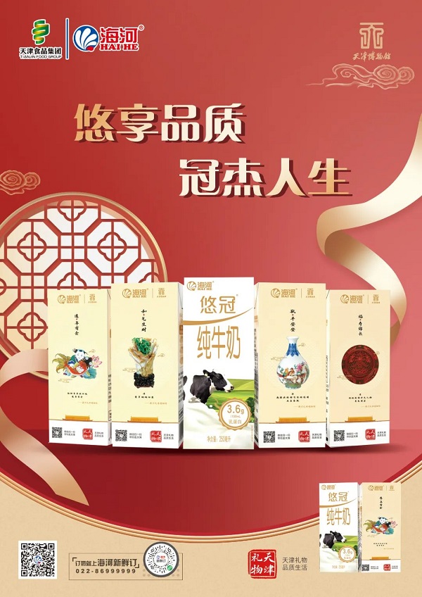 2023年推出首款跨界合作产品——天津卫老酸奶、悠冠纯牛奶。以天博文物为内涵,海河产品为载体,匠心与创新兼备,品味与文化融合,以“历史文化与天津文明凝聚”的理念,将“天津卫老酸奶、悠冠纯牛奶”通过产品包装设计与文物结合后全新呈现,在产品内容物设定上体现了天津深厚的文化积淀。将具有600多年历史的馆藏珍品清《乾隆漕运图》卷部分、“拱北”石匾、大沽船厂气锤、清大龙邮票文物元素展示在产品外包装上,突出了海河品质的历史积淀,赋予了城市发展的烟火气和文化底蕴。
