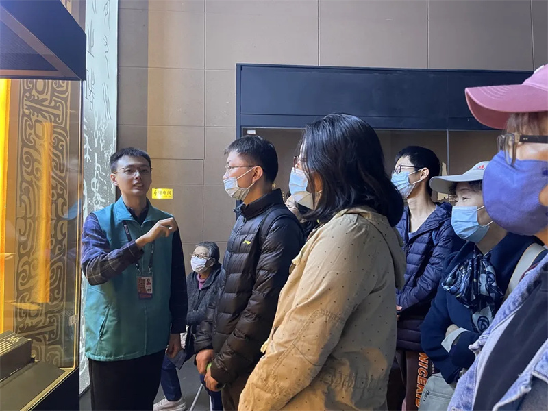 在“肇基文明——天津博物馆藏商周文物特展”展厅,“天博蓝”志愿者们为游客们讲解商周时期甲骨、玉器、陶器、青铜器等百余件器物,其中的许多文物都与古代祭祀息息相关。他们以小见大、以点带面,向观众展示中国早期文明夯基垒台、立柱架梁的恢宏气度,深深吸引着来自全国各地上至耄耋老人下至幼学孩童全年龄段的观众们驻足聆听。