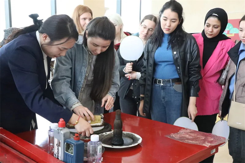 签约仪式后,进行了天津外国语大学行业导师聘任及“留学生第一课”活动。留学生在讲解员带领下参观一楼“天津人文的由来”展厅,了解天津城市的发展历程、历史人文的发展脉络。留学生们通过观展,进一步明晓天津历史文化渊源,在观史的同时解读身边的城市。参观结束后,结合展厅中的天津民俗,为师生深入讲述相关展品,并带领大家走进天博活动区亲手体验杨柳青年画的拓印绘制过程。学生们在创作中将理论知识与动手实践相结合,收获了一次特别的博物馆学习体验。