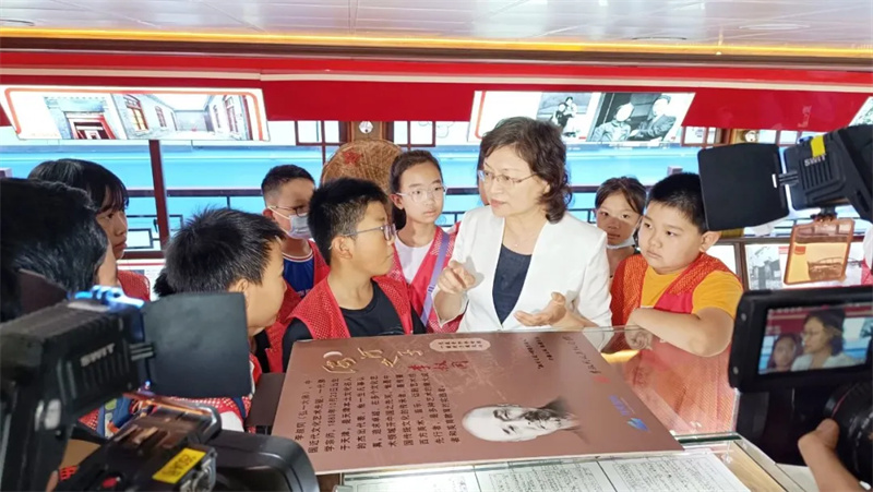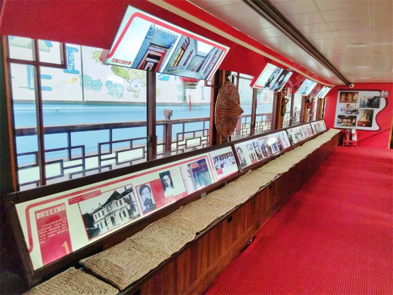 海河游船挖掘沿线历史文化,于2021年将一条画舫游船改建为流动的展馆,推出爱国教育主题展览。2023年,李叔同故居纪念馆将“海河之子—李叔同”主题展陈搬上游船,进一步丰富“天津红色记忆展”内涵。同时,在海河游船上举办开学季主题班会,充分发挥游船载体作用,将德育教育、红色教育与文旅融合,以“李叔同生平”及天津红色历史文化为切入点,在孩子们幼小的心灵中埋下“美育”的种子,激发青少年爱国、爱家乡的热切情怀,讲好天津文化名人故事,擦亮天津文旅名片。