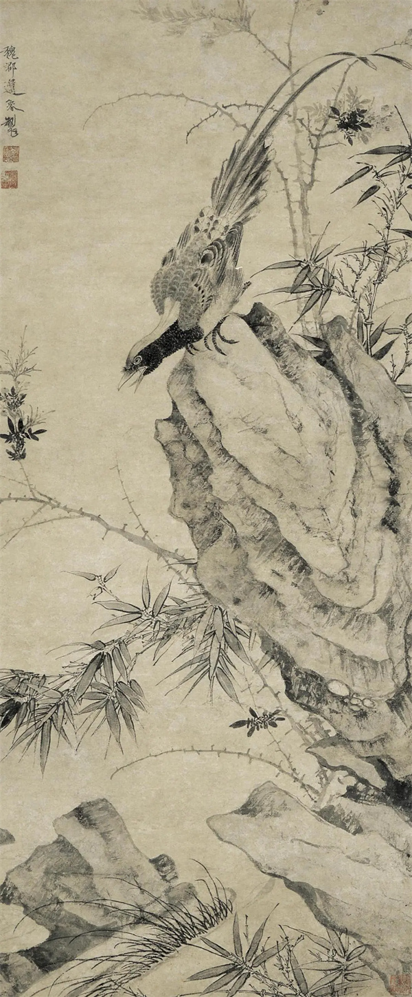 绘雉鸡、竹、石、兰等,以雉鸡比雄鸡,取“鸡鸣将旦,为人起居”之意,寓意平安吉祥。纯以墨笔绘出,不敷色彩,以墨的浓淡体现色彩变化,表现出元代花鸟画的新风格,与元代画家王渊的花鸟作品风格相类似。款署“魏郡边鲁制”。此图为边鲁传世绘画孤本,具有极高的美术史价值。