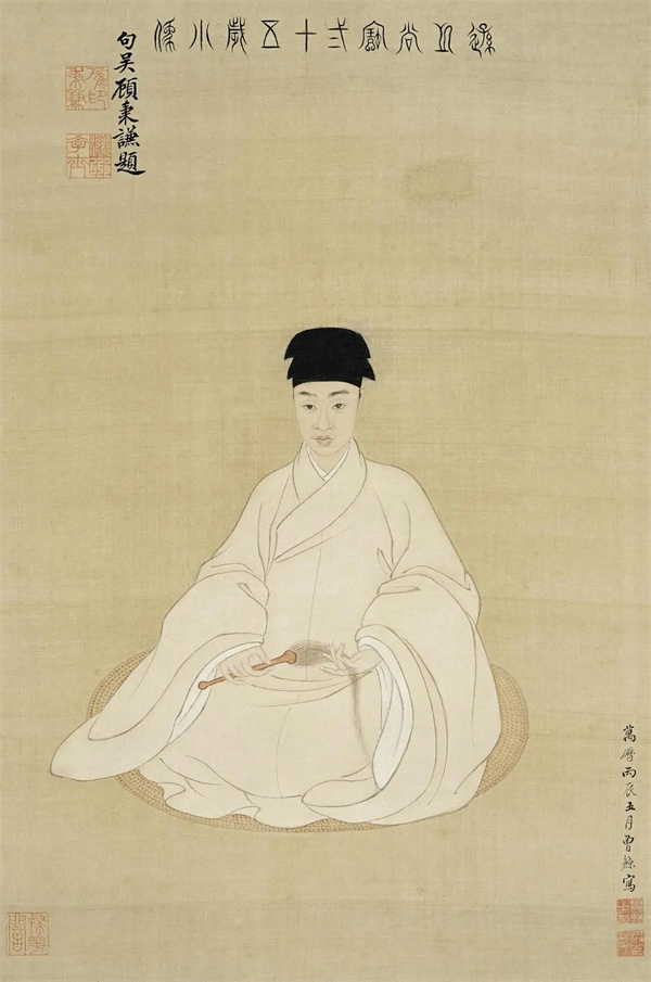 画幅右下侧画家署款“万历丙辰五月曾鲸写”。“万历丙辰”为明万历四十四年(1616),作者时年53岁。下铃“曾鲸之印”“波臣氏”二印。
