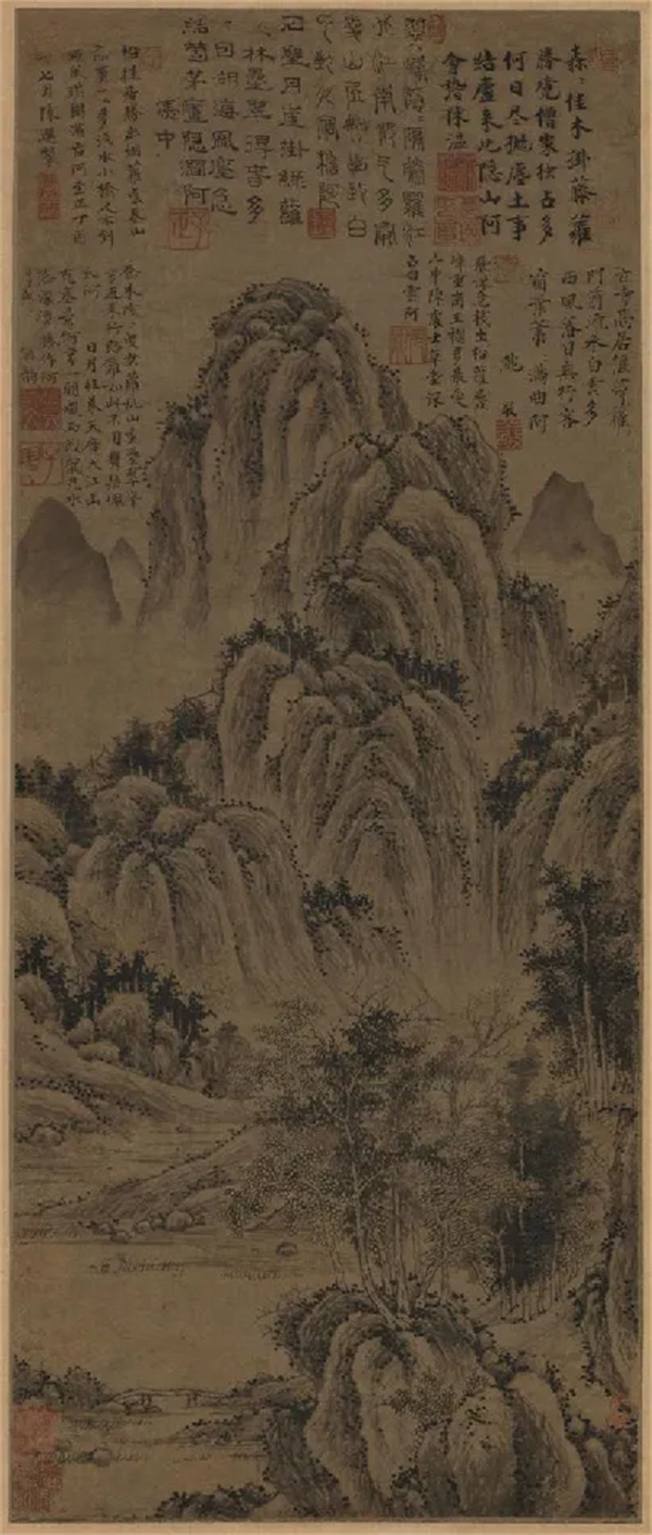 图绘翠峰叠嶂,古寺楼阁隐现丛林之中。画面构图疏朗有致,山石多皴点,描绘细腻生动,给人以山高气爽,幽深静谧之感。画面左上自题七言诗“□提居胜出烟萝,云尽山高爽气多。流水小桥人不到,西风琪树满岩阿。至正丁酉□七月陈选制。”铃白文长方印“举善”,迎首铃白文方印“长”。据作者自题,作品绘于元至正十七年(1357)。画面另有冯中、陈温、鲍敬、元宗、贺与文等人题诗。此图为陈选传世孤本。