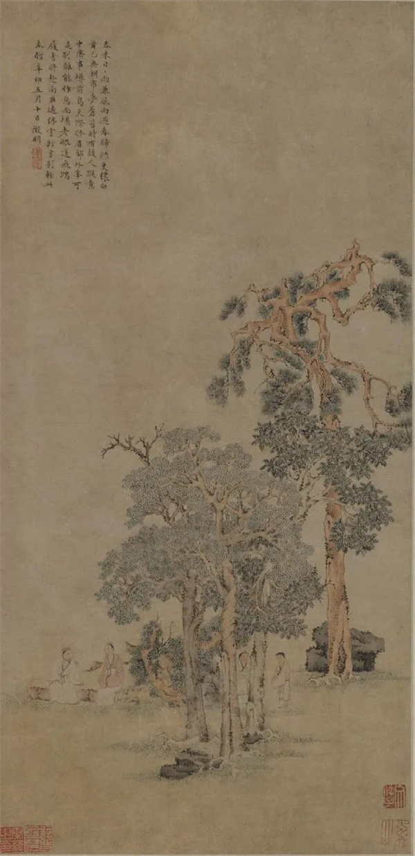 图绘松树劲秀苍健,虬曲多姿。树下二高士促膝而坐,神态闲适。全图笔墨细致清丽,别有趣味。