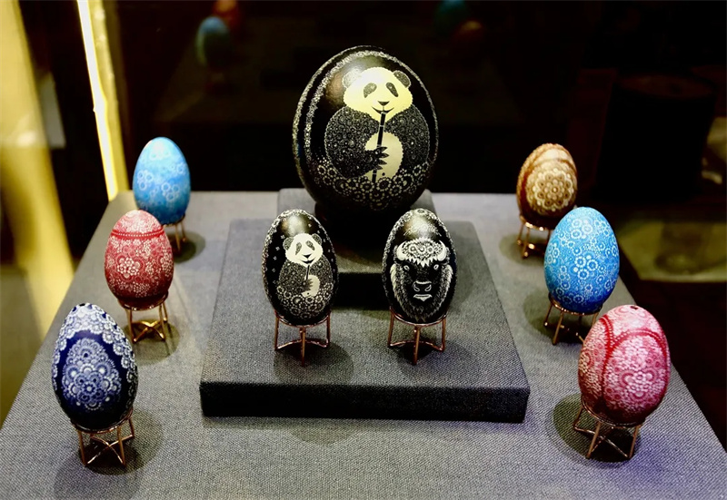 此次赠送天博的三件作品,系由在波兰享有盛名的非物质文化遗产传承人格拉日娜-费拉所创制。黑色蛋体上雕刻的图案分别为中国国宝大熊猫和波兰野牛,充分体现了中、波两国文化元素的交融。
