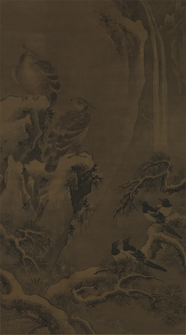绢本设色绘禽鸟于雪景山石、瀑流之间。作者工笔勾勒与水墨写意融为一体,所绘的禽鸟用笔简括传神,栩栩如生,并颇具气势,坡石用斧劈皴,笔墨爽劲。绘画受到林良写意花鸟风格的影响。