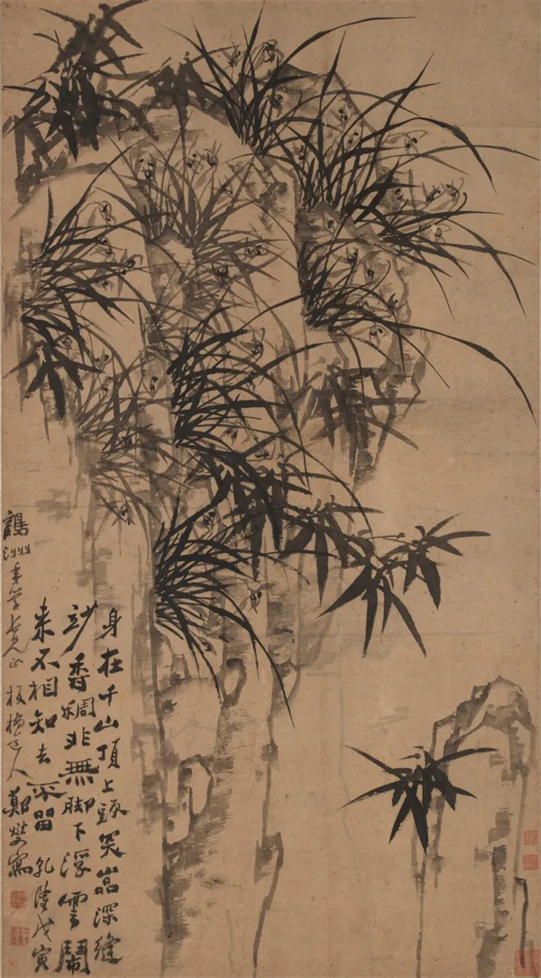 此图以水墨画危岩及丛生于其石缝中的兰、竹。所画兰、竹均用重墨,而画石则用淡墨,形成强烈的对比。兰草与竹叶笔力虬劲,干脆劲爽,显示出蓬勃的生命力。