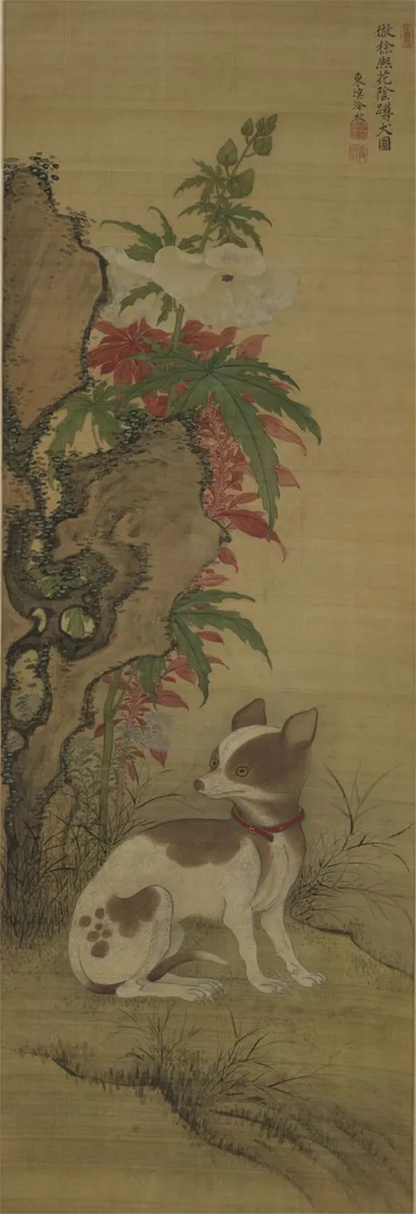 此图绘一只名贵小犬蜷坐在花阴之下。此小犬与《春闺倦读图》轴中所绘小犬几乎完全一样,只是在毛发的颜色上略有差异,应是照本所绘。只不过小犬在此作中以核心造型出现,毛发刻画的更加细致入微,眼睛也绘出高光,更为传神。画家自言仿徐熙笔法,山石上的苔点便是以徐熙所创的“落墨法”绘出。