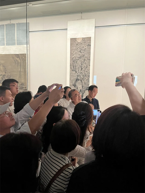 对谈结束后,观众跟随专家移步天津博物馆五楼“河上花:中国花鸟画之道1368-1911”展厅,两位学者结合重点藏品进行细致导赏,在直观阐述中国花鸟画创作手法的同时,勾画出花鸟画主题作品在明清时期的艺术面貌。临近活动尾声,博物馆工作人员向观众宣布了该展获评第二十一届(2023年度)全国博物馆十大陈列展览精品国际及港澳台合作奖的最新消息,大家聚集在展厅中难掩雀跃心情,不约而同向天博表示由衷祝贺。