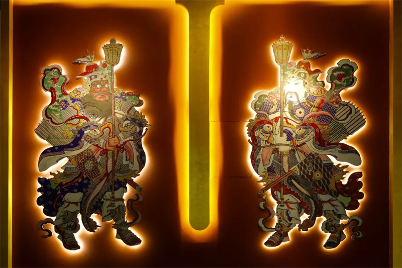 场景四:以杨柳青年画门神为设计灵感打造的贴门神造型墙,贴门神作为春节的重要习俗之一,人们相信其可以起到镇宅驱邪的作用,通过巧妙设计,向观众朋友们传递中华传统文化习俗。
