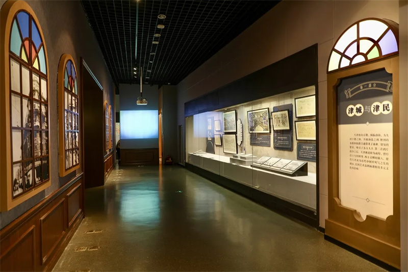 场景一:走过序厅,长廊墙壁上拱形的窗户和彩绘玻璃内的老天津城的照片与视频,仿佛使人穿越回那个时代。这一场景的设计充分体现了“情境化设计”的理念,使观众能够身临其境地感受历史和文化的氛围。