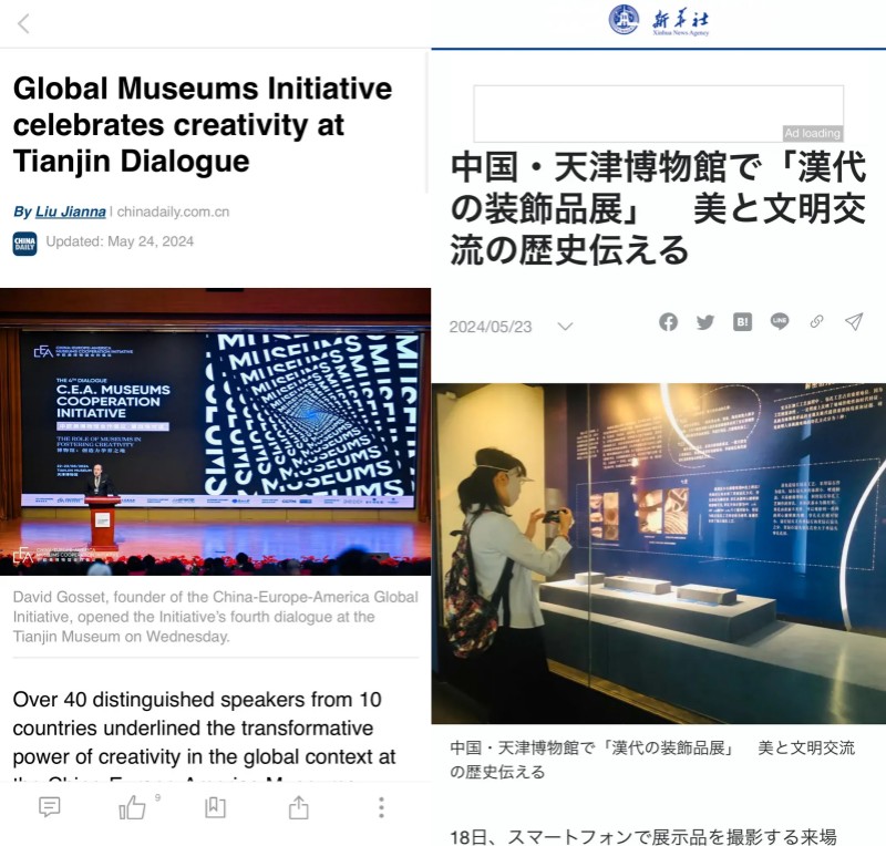 围绕“中欧美博物馆合作倡议对话”活动,CGTN展开报道:来自9个国家和地区的近50位嘉宾齐聚天津博物馆,大家交流思想和经验,加深相互理解,为跨境合作开辟新途径。本次活动的亮点在于汇集了多个国家、不同艺术行业的人才,大家通过交流碰撞新的思想火花。同时,CGTN记者和博物馆代表探讨对博物馆合作的看法,以及如何落实习近平总书记在中国共产党与世界政党高层对话会上提出的全球文明倡议。博物馆不仅是文化遗产的守护者,更是促进国际文化交流和理解的重要平台。博物馆间合作的关键是开放包容,要接纳和展示多元文化,拓宽全球视野,为博物馆带来新鲜血液。积极落实“全球文明倡议”要植根于中华优秀传统文化,讲清楚历史渊源、发展脉络,以及独特创造、价值理念等,进而增强文化自信和价值观自信。同时,也要向其他辉煌文化学习,创造性发展中华优秀文化。