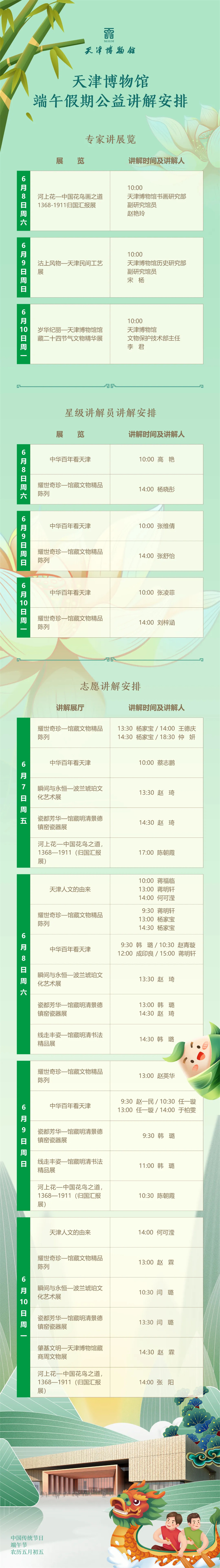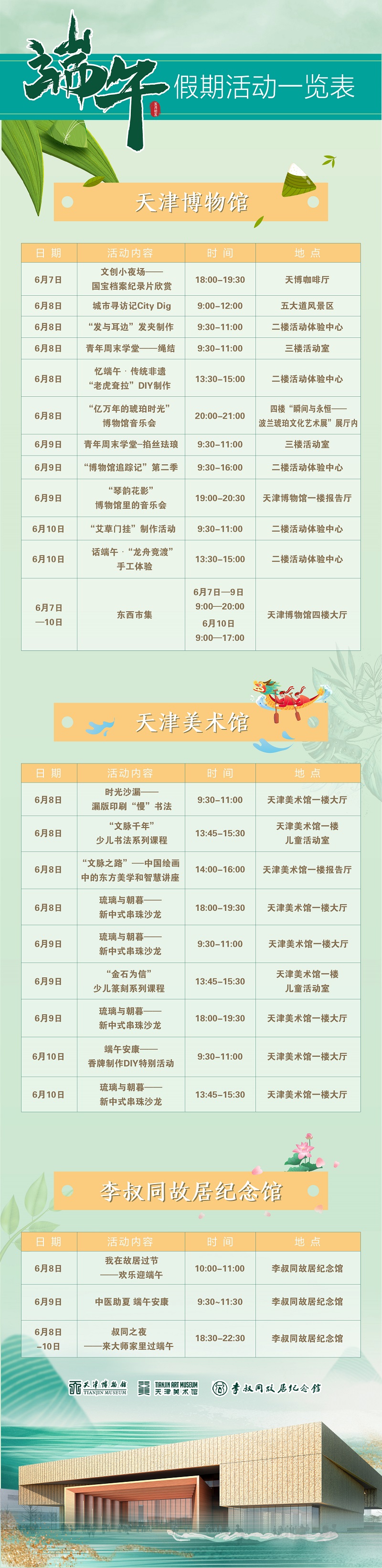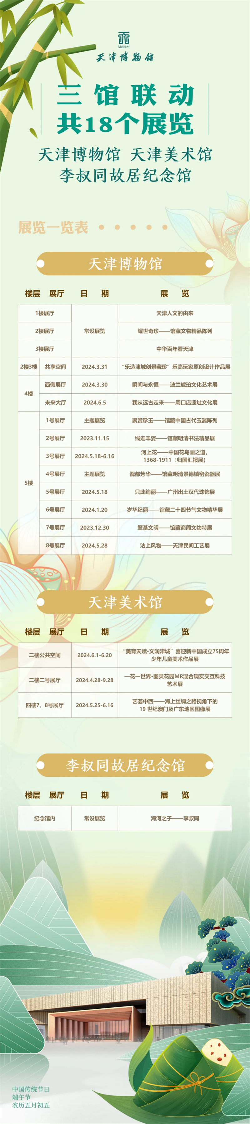 端午节,是中华民族重要的传统节日,也是我国首个入选世界非物质文化遗产名录的节日。当“端午节”邂逅“文化和自然遗产日”,注定让这个粽意飘香的假期多了一层浓厚的文化底蕴。值此节日来临之际,天津博物馆、天津美术馆和李叔同故居纪念馆联手策划,围绕传统端午习俗、文化遗产保护主题开展系列活动,邀请全国、全市观众朋友们走进博物馆,共度文化假期。