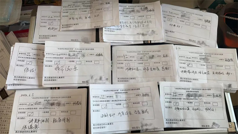 为了保障讲解质量,及时得到听众们的意见反馈,我馆特意开展满意度调查,制作意见反馈单,收取大家的意见建议。在满意度调查中,我馆讲解获得各级单位的全优好评,收到了“展览精彩、讲解出色”、“博物馆里的生动党课”等真诚反馈。来参观的党员们纷纷表示,通过讲解员声情并茂地讲解,进一步加深了对党的纪律建设历程的了解,强化了纪律意识、加强自我约束、提高免疫能力,进一步增强政治定力、纪律定力、道德定力、抵腐定力,始终做到忠诚干净担当,为全面建设社会主义现代化大都市、奋力谱写中国式现代化天津篇章贡献力量。