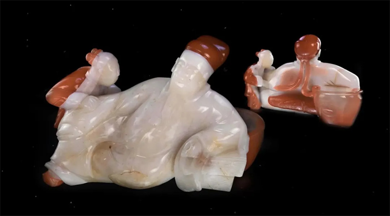 红白玛瑙李白像,高5.8厘米,宽10.5厘米。李白像作酒后醉卧状,侧身倚着酒缸,半倚半卧,戴冠,宽衣博带,三缕长髯飘垂于胸前,左手支于书函之上,两腿交叠,右手抚膝,神态迷离,似醉犹醒。作品将诗仙超然脱俗的陶醉之状,刻画得精微真切,淋漓尽致。李白身旁有一书僮,头梳抓鬏,面露稚气,轻抚李白右臂,引颈探身,以关切的目光注视着李白,天真纯情,栩栩如生。整个作品富有强烈的艺术感染力。