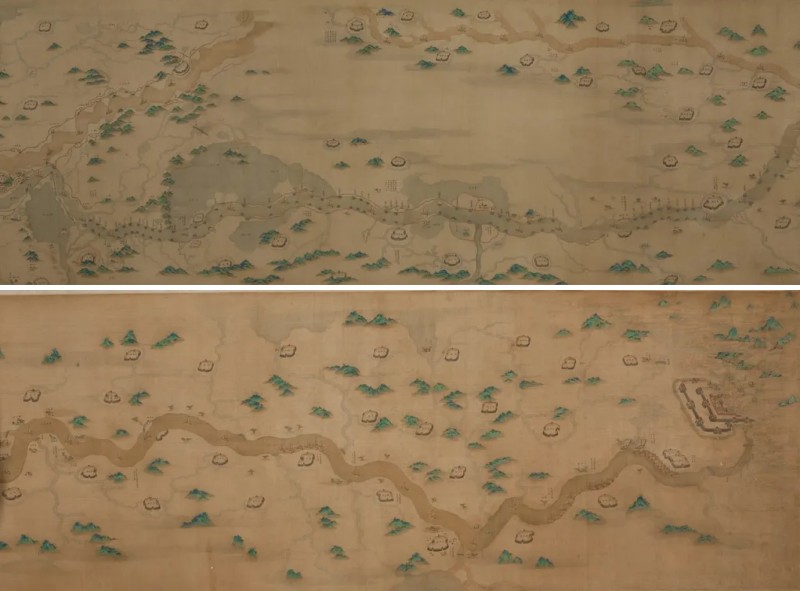 这张图绘制于清代乾隆年间,当时京师的给养主要征自江浙豫皖赣鲁等地区,尤其是漕粮运输基本上就是靠南北贯通的大运河完成的。该图采用了平立面结合的鸟瞰式形象画法,将运河沿途的城市、山脉、河流、湖泊、闸坝、桥梁、村庄等地理景致精美地呈现在图上,连不同的水流都以多种颜色做区分,这种作画方式在漕运图中较为罕见。此外,画卷上的山川部分采用了石青、石绿等鲜艳的矿物质颜料绘制,在当时这些颜料都是十分昂贵的。