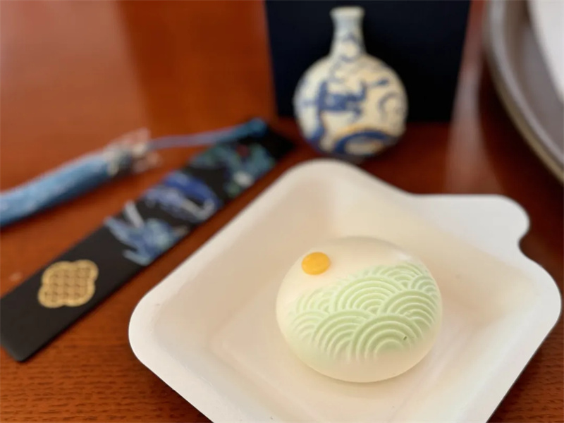最后要介绍的是“海月薄荷柠檬芝士”,这款甜点的设计灵感来源于中国古代器物纹饰中的海水江崖和对月亮的赞美。甜点表面采用了淡绿色的薄荷糖霜,模仿海水的波光粼粼,给人以清新自然的感觉。而那黄色的柠檬芝士则被巧妙地塑造成了月亮的形状,点缀在薄荷糖霜之上,犹如海上的明月,相映成趣。这款甜点的口感清新甜美,薄荷的清凉与柠檬的酸甜相互交织,让人仿佛置身于海边月色之中,感受到大自然的宁静与和谐。