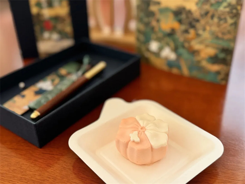 首先介绍的是名为“繁华山楂芝士”甜品糕点,它的设计灵感来源于天津博物馆藏明仇英《桃源仙境图》。这款点心设计精致独特的桃花造型,一半是粉嫩可口的山楂芝士,另一半则是清新自然的白色芝士,两种口味交相辉映,色彩对比鲜明,犹如“一往桃花源,千春隔流水”。甜点顶部那只小巧玲珑的蝴蝶,仿佛是用糖艺匠心独运而成,栩栩如生,它停歇在花蕊之上,仿佛在轻轻地诉说着春日的繁华与生机。