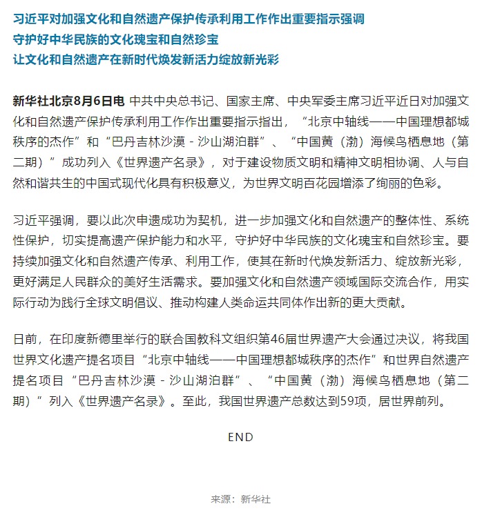 习近平对加强文化和自然遗产保护传承利用工作作出重要指示