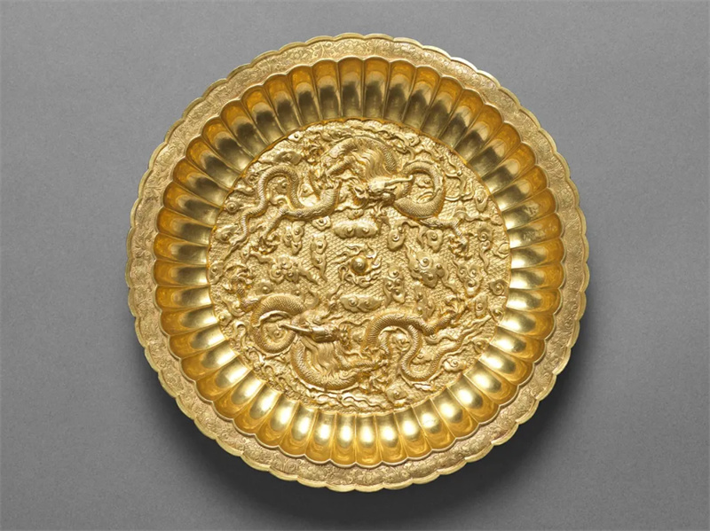 在中国传统纹样中,龙纹占有举足轻重的地位。2024年是农历甲辰龙年、藏历木龙年,这件珍贵展品中所蕴涵的中华美学,展现了中华民族的血脉自豪,讲述着西藏与内地交往交流交融的故事。此盘中心圆内饰双龙戏珠纹,主纹间饰如意云纹,盘边饰缠枝花卉纹,盘外形为多瓣菊花形,属祥瑞之首。整个器物以黄金做材质,做工精致,呈现出璀璨华贵、吉祥喜庆之气。文化认同是最深层次的认同,西藏人民对“中原龙”从向往、接纳、吸收,直至融入审美与精神,展现了民族大融合的壮阔史诗。