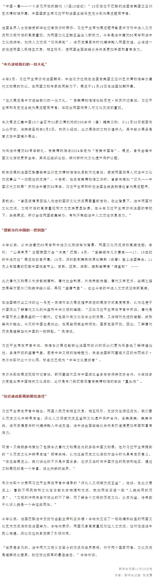 为中法文化互融互鉴注入新动力——习近平主席为巴黎唐代文物展题序引发法国各界热烈反响