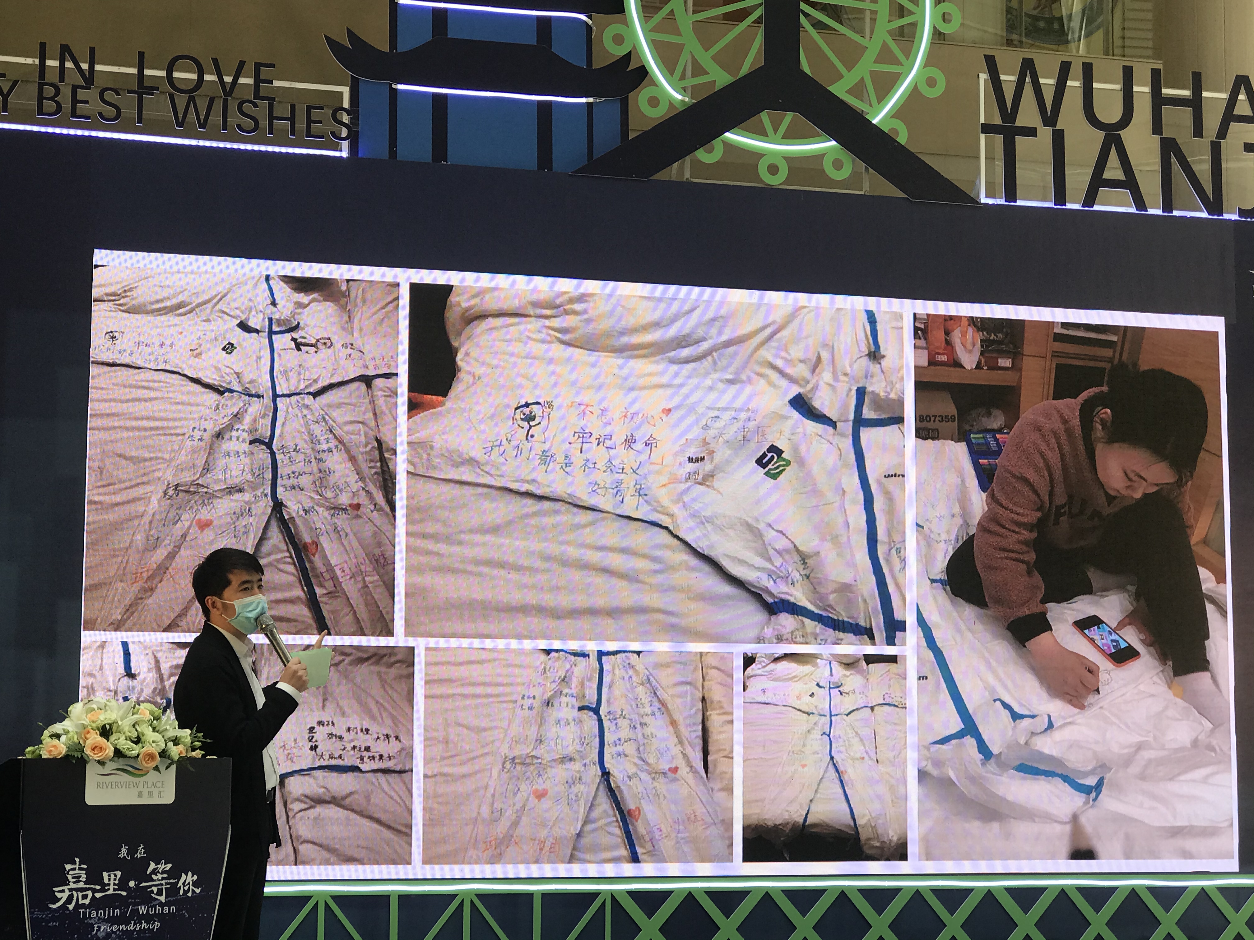 这件防护服是武汉长江日报在2020年护士节送给天津人民的一件特别的礼物。在现场大荧幕上,长江日报品宣部总监李翌激动地说,当得知天津举办“我在嘉里等你”的活动时,大家都非常期待能借助这个活动向天津市民以及帮助我们武汉抗疫的医护人员们道上一声感谢。