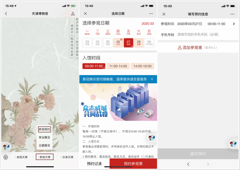 2、微信搜索“天津博物馆”微信公众号-“参观天博”-“参观预约”栏目进行实名预约。