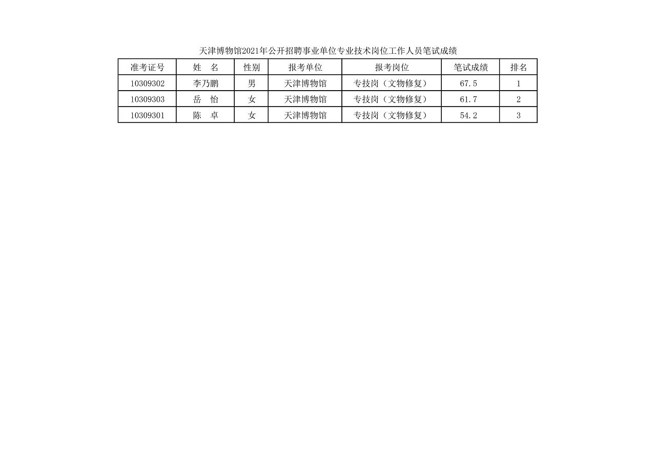 天津博物馆2021年公开招聘事业单位专业技术岗位工作人员笔试成绩